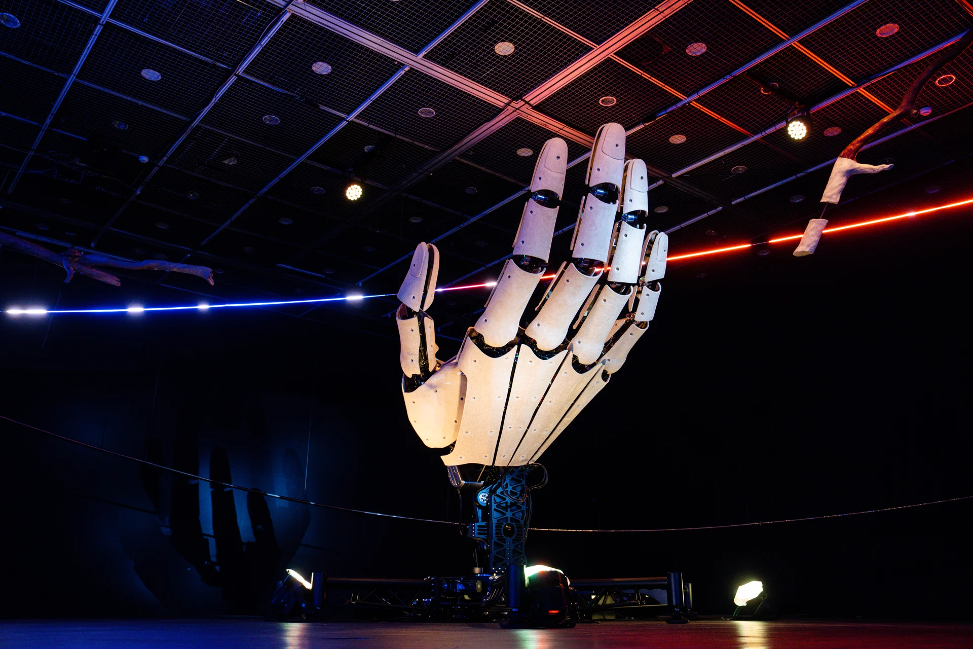 豪華朗機工在成軍15年的回顧展「宇宙寫生」中的作品《宇宙201》,有一座巨大卻柔軟靈活的機械手裝置,它和漂流木的碰觸,讓我想到米開朗基羅的《創世紀》,上帝伸出手指將靈魂傳遞給亞當;倘若輕輕一點就有了生命,那麼結束和重啟,是否也是一鍵完成?《最後一問》是豪華朗機工為歌劇院的限地製作,一場無人的劇場表演,從地球的光、宇宙的影開啟對話,講述萬物的連結和循環,背後是否有雙「看不見的手」在操控?