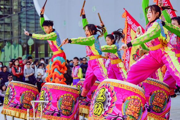 在振奮人心的咚咚鼓聲中,靈活的金獅翻躍、俏皮地眨眨大眼,舞動出歡騰的新春氣氛,完全抓住圍觀民眾視線。「能在國家級場館表演,是我們團員的榮譽,很開心臺灣龍獅文化被肯定。」王功兩廣國術龍獅戰鼓團(簡稱龍獅團)團長巫松軒表示,自2022年起與臺中國家歌劇院合作,2026年是第4度受邀,讓這支成立逾30年的團隊,年年以創新橋段,為國內外的觀眾帶來年味驚喜。