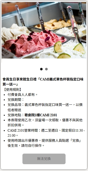 優惠券限使用乙次,如因操作錯誤,按鈕畫面成「已兌換」,則視同已兌換生日禮,恕不接受再次兌換,敬請留意,謝謝!