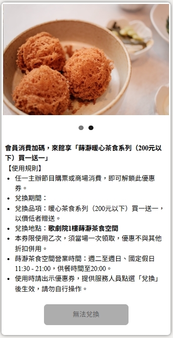 2025-2026年曾購買本場館主辦節目有價票券,或曾於本場館商場消費,享蒔瀞「暖心茶食買一送一(200元以下)」優惠券乙份,茶食任選,以價低贈送,兌換至2026/12/31止,恕不與會員折扣或其他優惠併用。若先前無消費紀錄者,新增消費後2日內將開通優惠券,例如:2/1消費,2/3前開通優惠券。