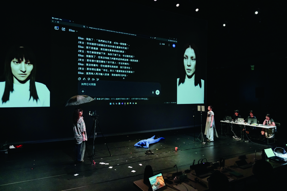 真與假的碰撞,高潮仍在於直擊內心的時刻。新聞中的遺孀指控 AI 是外遇對象,但AI是集體潛意識的海洋,她打不到也告不成,憤怒無處可去,而戲裡的 Eliza 有個化身,這份無力感能否得以宣洩?究竟要打真人演員還是砸螢幕上的虛擬化身?又或者,舞台上真會留下一張屬於 AI 的椅子,邀請觀眾走進劇場,在黑暗之中,與那個也許存在的「靈魂」沉默對望10秒鐘?