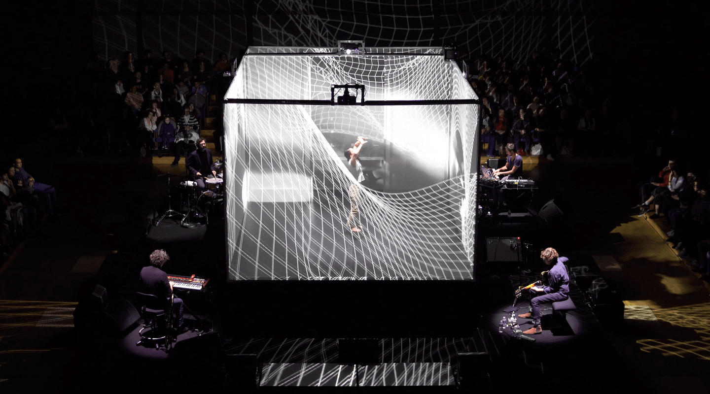 これはコンサートでもあり、視覚と聴覚を伴った旅でもあります。『Équinoxe(昼夜平分時)』は、変化し続ける光と影、昼と夜が入れ替わるその瞬間のようにあっという間な特別な瞬間。フランスのリヨン出身のテクノロジーアーティスト、ザ・カンパニーM&Bは前作『Hakanaï』(儚い)同様、3Dで投影された立方体のモチーフの中にダンサーが閉じ込められているような、現実と虚構が交錯する映像を作り出します。そして、そこにマイルドなジャズとハイトーンなスペースロックが融合したようなリムジンの音楽を合わせることで、Live Bandが演奏するロードムービーのように見る人の想像を掻き立てる作品です。