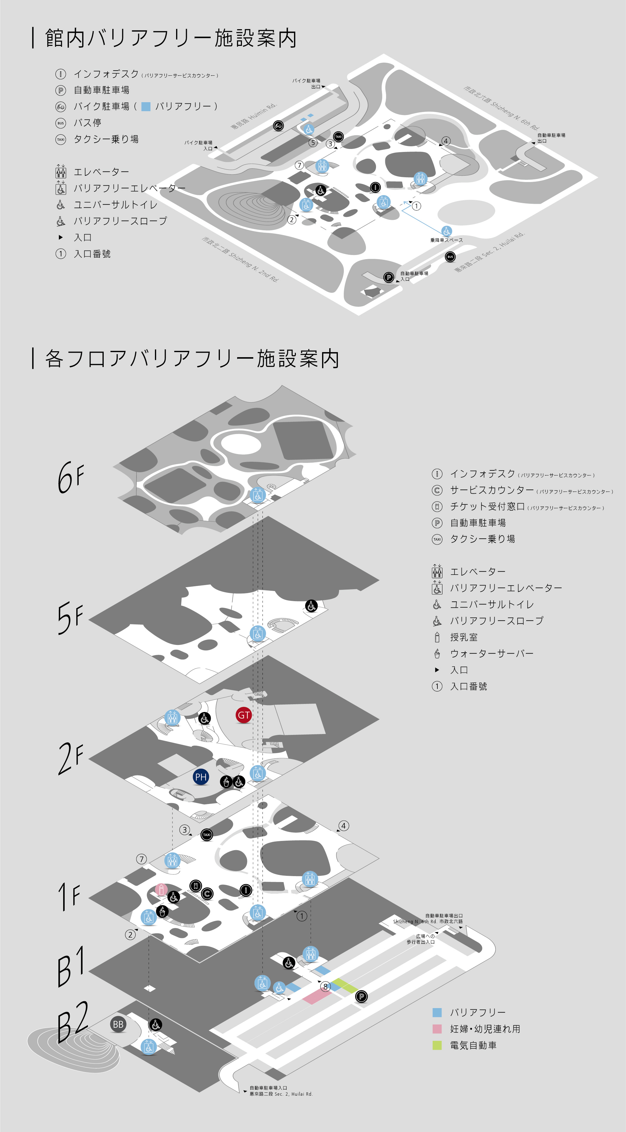 - バリアフリーエレベーター:B2、B1、1F、2F、5F、6F