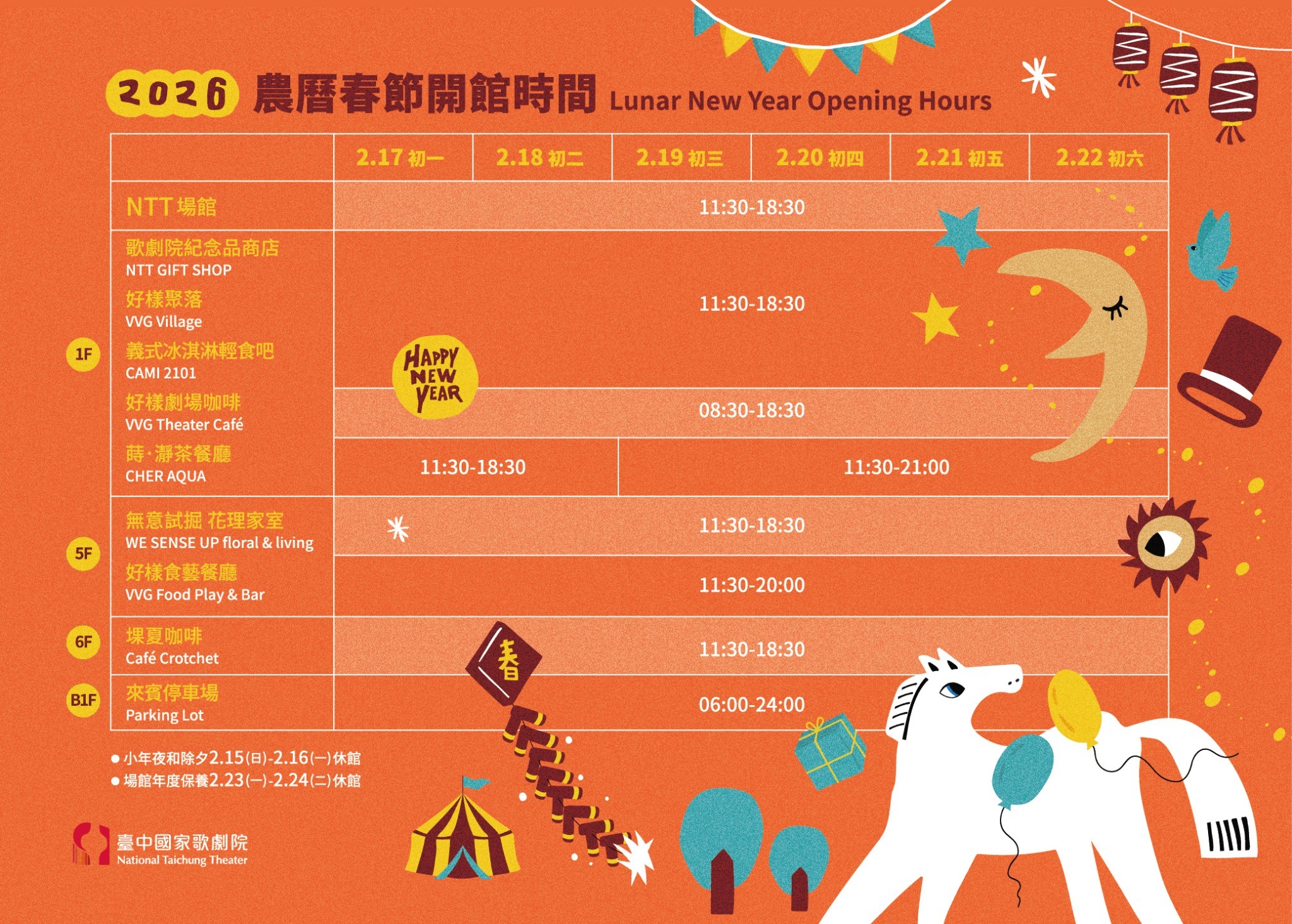 2026農曆春節開館時間公告 小年夜和除夕 2/15(日)-2/16(一) 休館,客服電話及客服信箱暫停服務,汽車停車場正常營業。初一至初六 2/17(二)-2/22(日) 客服電話服務時間調整為10:00-18:30。年度停電保養 2/23(一)-2/24(二) 休館,客服電話及客服信箱暫停服務,汽車停車場暫停開放。 回到上一頁