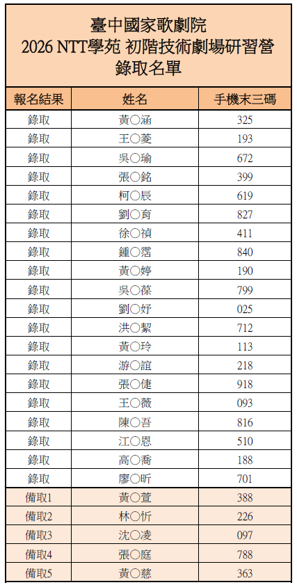 2026 NTT學苑 初階技術劇場研習營 錄取名單