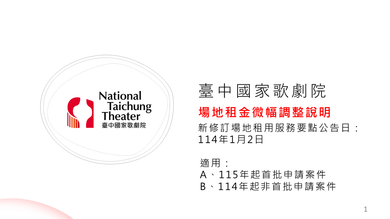 國家表演藝術中心臺中國家歌劇院場地租用服務要點修訂於113年11月27日董事會通過、113年12月24日文化部核定,適用於114年1月1日起之新場地申請案,詳細內容請見「國家表演藝術中心臺中國家歌劇院場地租用服務要點」。