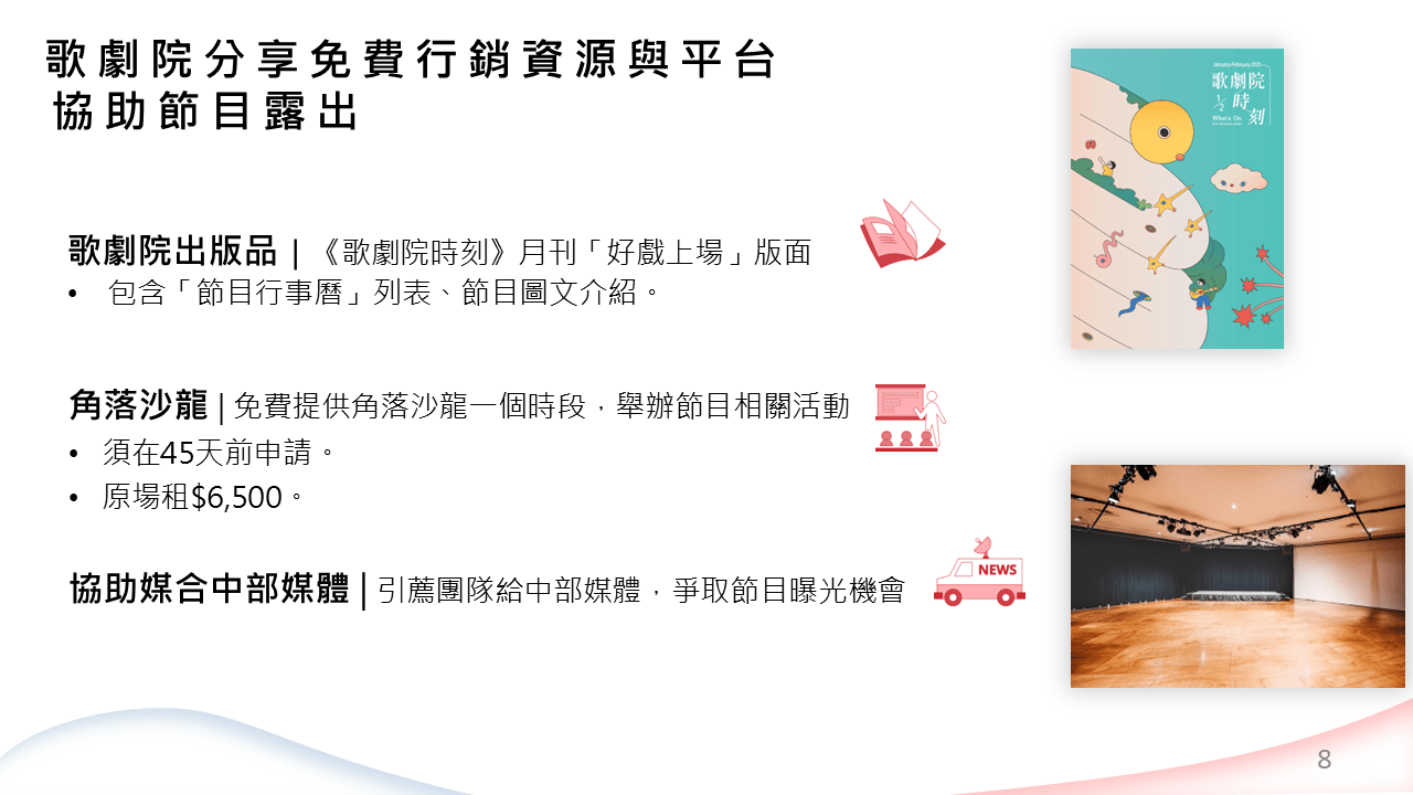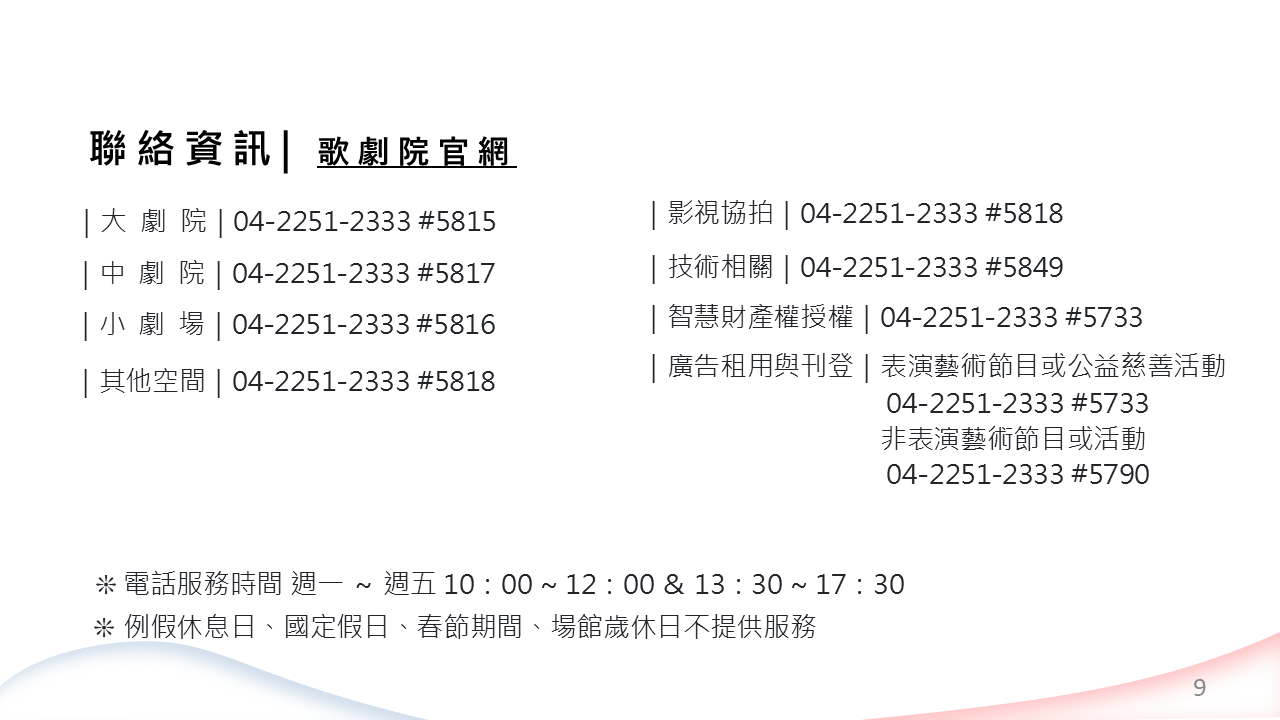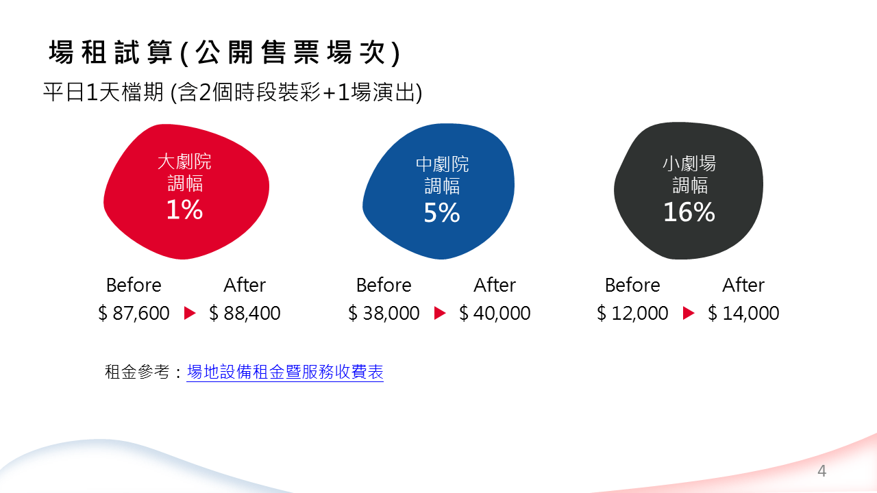 已送件申請、已簽約者,及114-115年藝術夥伴場地租用案,均以原場租收費,如遇問題請洽歌劇院各場地服務窗口。