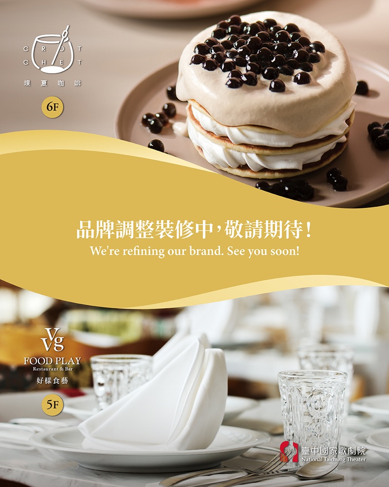 臺中國家歌劇院6F堁夏咖啡café crotchet、5F好樣食藝餐廳 VVG foodplay and bar自即日起進行品牌調整裝修,暫停服務,並分別預計於6月份、9月份重新開幕。