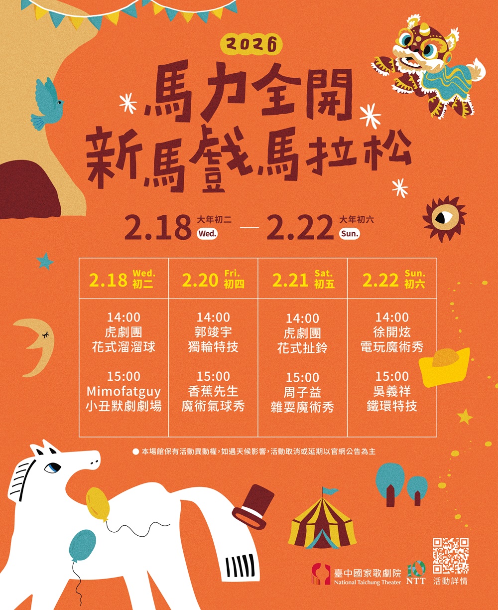 原訂於臺中國家歌劇院演出新馬戲馬拉松2月20日(五)14:00《吳義祥|鐵環特技》及2月22日(日)15:00《郭竣宇|獨輪特技》,因團隊行程異動,將調整為2月20日(五)14:00《郭竣宇|獨輪特技》及2月22日(日)15:00《吳義祥|鐵環特技》,如下表更新。