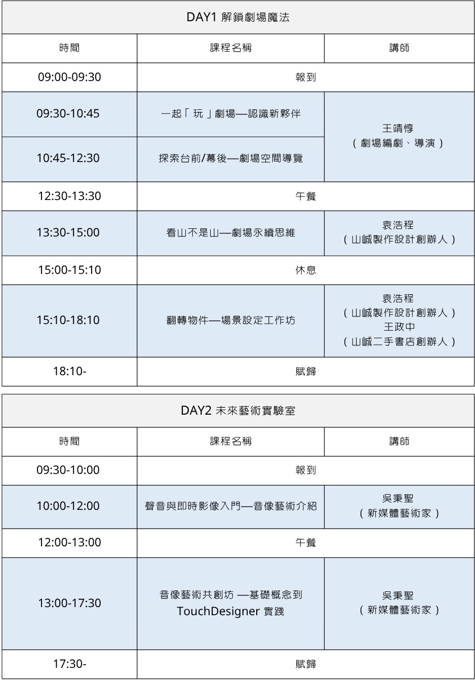 2025 年的 2 日課程以「進入劇場,開啟想像」為策劃核心,聚焦「解鎖劇場魔法」與「未來藝術實驗室」主題,首日課程內容涵蓋表演潛能開發、劇場深度導覽及永續劇場製作,建構學員對於表演藝術的基礎概念;第二天以音像藝術為媒介,讓學員由此展開科技藝術的探索之旅,藉由知識學習和模組化實作練習,實驗聲音與影像結合的創新想像。