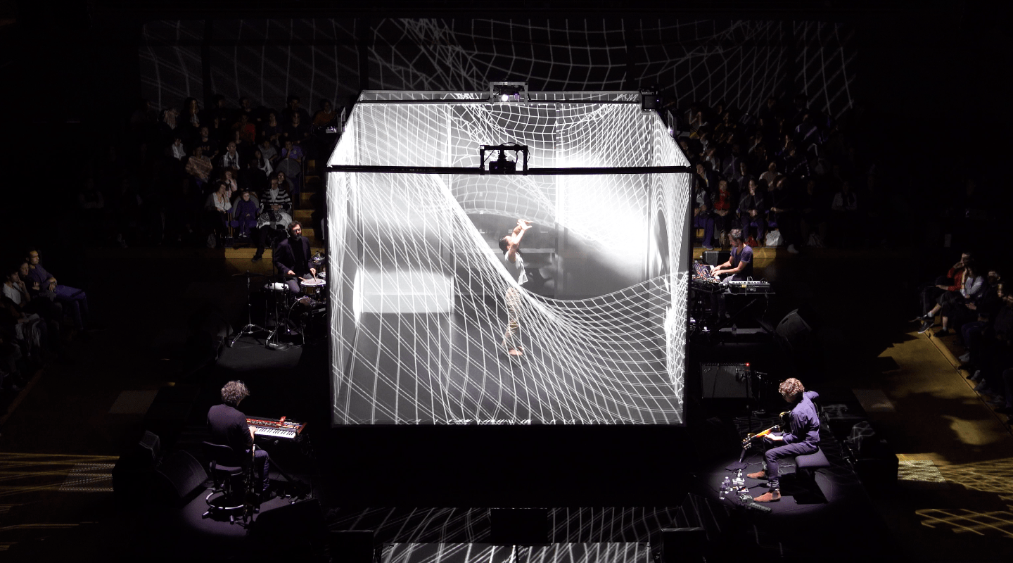 這是一場音樂會、也是一趟視覺與聽覺同行的旅程。《晝夜切分點》不停幻化的光影,像是晝夜之交的片刻,短暫而獨特。來自法國里昂的科技藝術家M&B雙人組延伸前作《Hakanaï》的立方體3D投影概念,讓舞者被圍繞在現場生成、獨一無二的虛實交錯影像中,豪華禮車樂團融合綿長的冷調爵士和緩飆的太空搖滾,宛如Live Band演奏的公路電影,帶給觀眾無限想像。