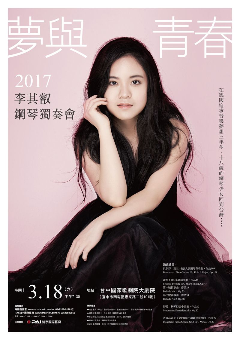 二0一七年春天,十八歲的少女回到台灣,熱切地想要藉著貝多芬、蕭邦、舒曼和普羅高菲夫或飛揚或浪漫或深沉的作品,和故鄉的觀眾分享她的「夢與青春」,有夢、追夢的青春,也是有故事有激情的青春!