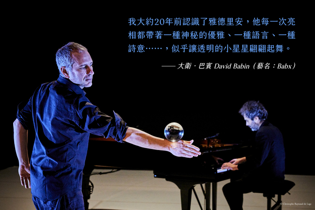 20年前,兩名法國年輕人在亞維儂一處表演空間相遇,大衛.巴賓(David Babin)在鋼琴上試彈新譜的曲子,雅德里安.孟朵(Adrien Mondot)是透過玩雜耍逃避枯燥工作日常的電腦工程師;如今,大衛成為法國樂壇知名的才子歌手、詞曲創作者、編曲家及鋼琴家Babx,發行數張廣受好評的音樂專輯;雅德里安則以科藝創作雙人組Adrien M & Claire B成名,結合數位與肢體的跨界創作,活躍於國際各大藝術節,曾以《大潮》、《晝夜切分點》等作品受邀至歌劇院演出,憑藉其獨特的影像視覺風格,廣受好評。