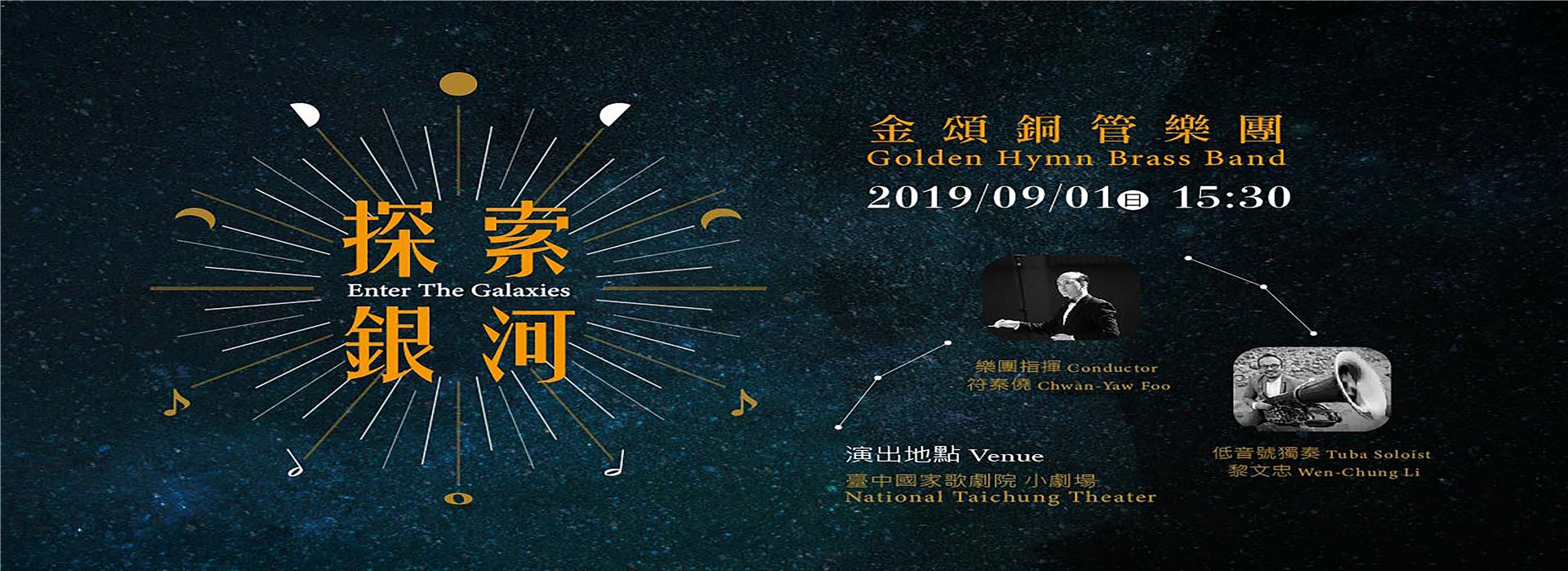 2019年樂團首次到中臺灣地區演出,因應銅管樂團的聲響需求,以臺中國家歌劇院小劇場為首要考量場地,作為《探索銀河》演出呈現的理想條件,演出具天文奇景特色的經典銅管樂團作品《宇宙的音樂》,結合燈光、投影的先進科技,以現場銅管樂團震撼的聲響效果,構成絕佳的演出經驗。同場演出,我們也邀請到臺灣知名低音號演奏家黎文忠(LI Wen-chung)一同參與,演出兩首具代表性的低音號銅管樂團作品,持續為推廣銅管器樂演奏作努力,為臺灣本土教育扎根。