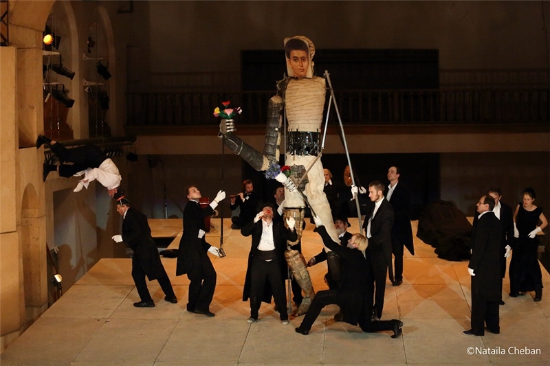 導演德米特里.克雷莫夫說:「我們沒有直接引用莎士比亞劇作的原文,反而是在經典莎劇的題材上,用自己的話語說故事。」 從《仲夏夜之夢》(A Midsummer Night’s Dream) 中婚禮意象出發,擅長營造強烈視覺張力的德米特里.克雷莫夫再度展現精湛的想像力,以其獨特的詮釋觀點融合夢境與現實、荒謬和奇觀,徹底打破觀眾預期及觀戲經驗,讓兩只六米高,可任意拆卸的巨型木偶、雜技演員、歌手、舞者與小狗化身排演經典劇中劇「最悲慘的喜劇」(tragic mirth)的工匠,在舞台上創造出一幕幕新奇幻妙、光怪陸離的超現實場面,失序拼貼滑稽橋段體現莎翁《仲夏夜之夢》的重要意念:當太陽升起,失序終將回到秩序,因為這一切只是仲夏夜的一場夢而已。