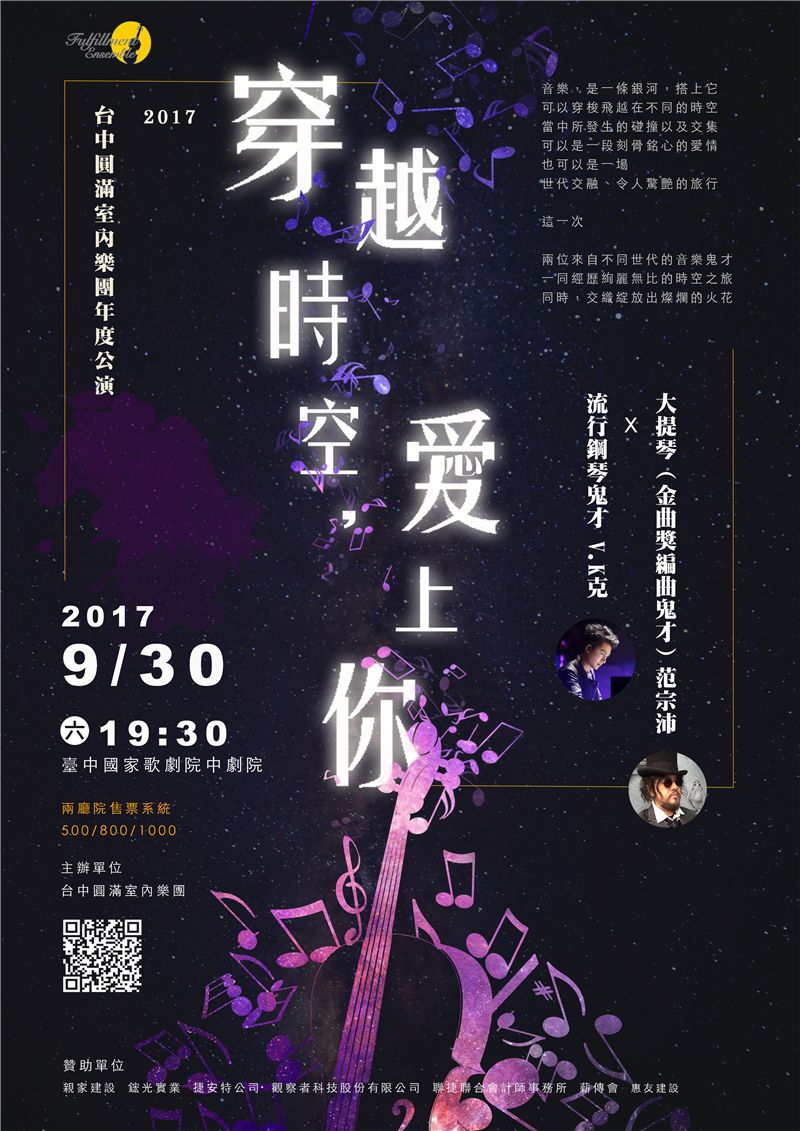 台中圓滿室內樂團與新生代鋼琴王子V.K克在音樂的演出及創作上均致力於跨界曲風的呈現,2016年在台中市文化局所舉辦的逍遙音樂町中有精彩的合作演出,獲得觀眾高度的肯定與喝彩。這個成功的合作演出十分具有紀念意義,在今年圓滿樂團十週年之際,希望在臺中國家歌劇院的國家級場地擴大展演,因此此次更隆重邀請來重量級的金獎創作才子暨大提琴家范宗沛老師加入演出陣容,以穿越時空為主題,相信兩位來自不同世代的音樂鬼才,會與圓滿樂團共同帶來一場不同以往的音樂饗宴。
