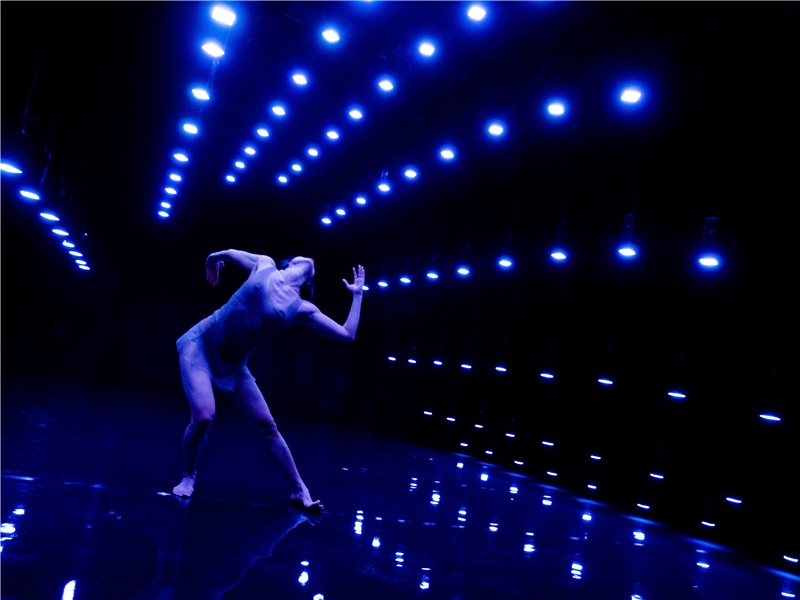 大量整齊排列的燈泡隨時變化著,背景聲響彷若工廠馬達不斷加速,不時見到她(蘇文琪)緊繃的肌肉線條突然透過一陣雙臂劃圓而放鬆,又在下一秒進入新的張力。