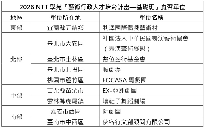 2026 NTT學苑「藝術行政人才培育計畫─基礎班」