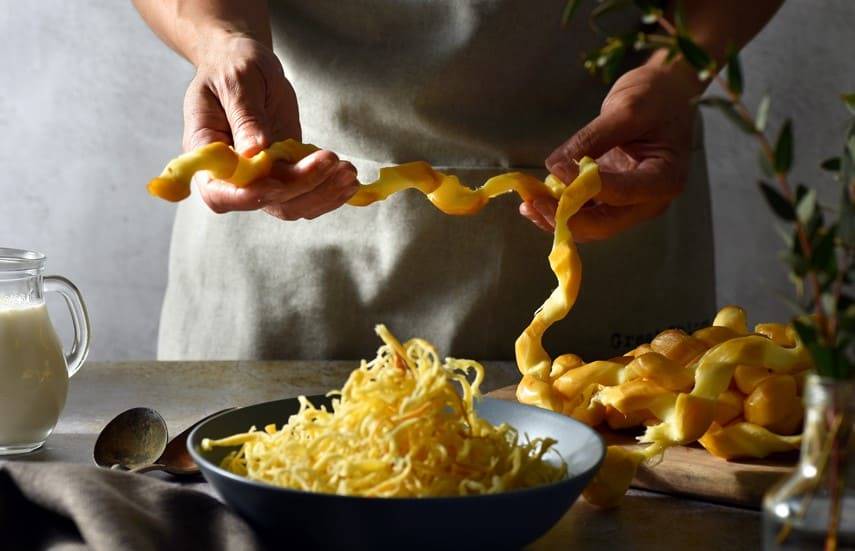 原味千尋創立於2006年,堅持以手感剝絲,把紮實的辮子乳酪剝成一絲絲,手工現烤精心烘培,讓乳酪絲外層金黃酥脆;